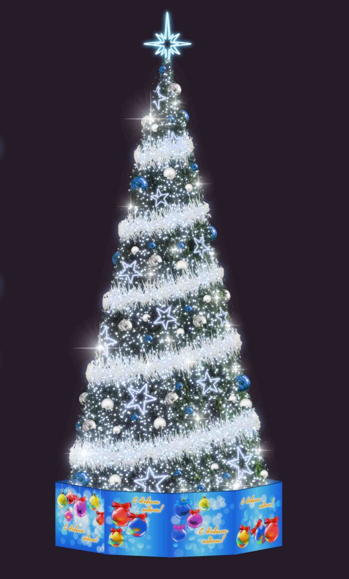 Новогодняя ель высотой 8 метров, модель СК-303 — это профессиональное световое решение для оформления городских и коммерческих пространств. Она одинаково эффектно смотрится на площадях, возле бизнес-центров, в ТРЦ и парках, создавая атмосферу праздника и уюта. Каркасная конструкция 3D-формата с густой хвоей, сияющей холодным светом, становится центральным элементом новогоднего декора. Комплект поставки включает световую верхушку, иллюминацию, декоративные и световые игрушки, а также ограждение — всё для быстрого и гармоничного монтажа.