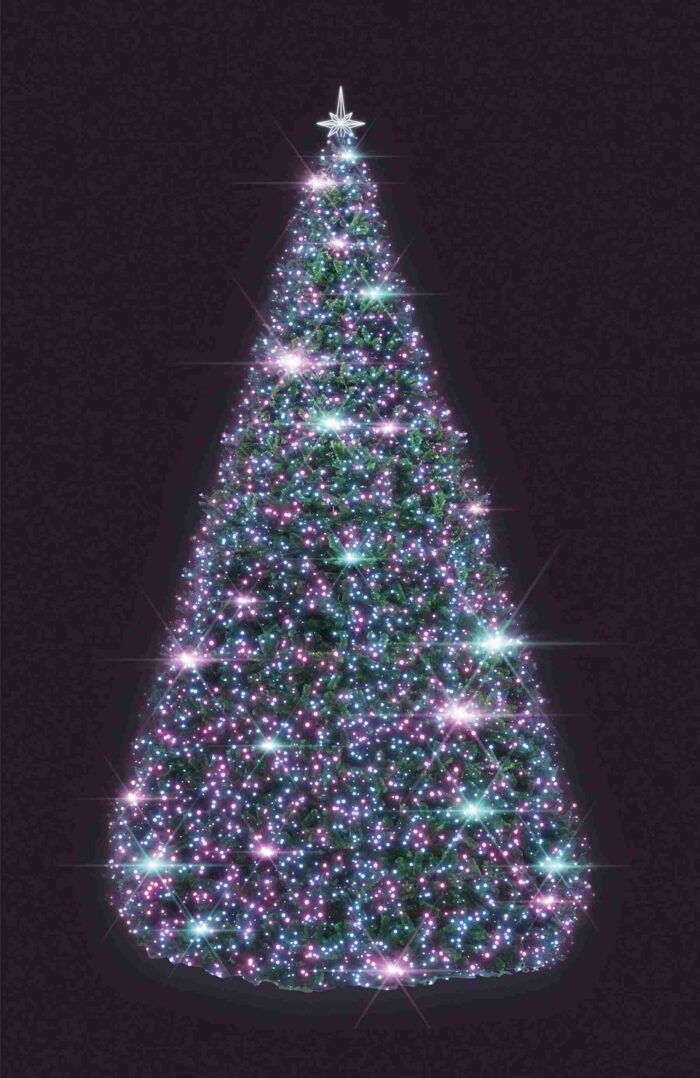 Подсветка выполнена на основе энергоэффективных LED-элементов с холодным свечением. Такой оттенок отлично читается в городской среде и подчеркивает праздничную геометрию ели. Возможно добавление динамики, регулировка яркости и подключение к системам автоматического управления по запросу.