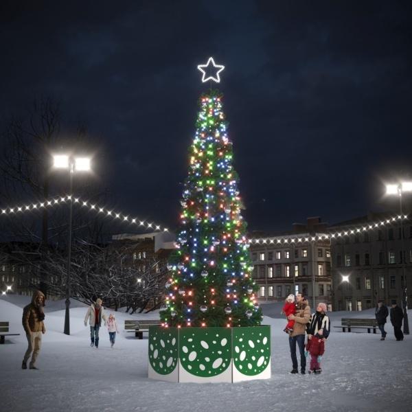 «Самоцветы» — это уличная световая ель, которая сразу привлекает внимание. Благодаря насыщенной подсветке и ярким декоративным элементам она создаёт торжественное настроение и становится центральным элементом в праздничном оформлении. Высота 7 или 9 метров позволяет использовать её как в локальных зонах, так и на крупных городских площадках.
