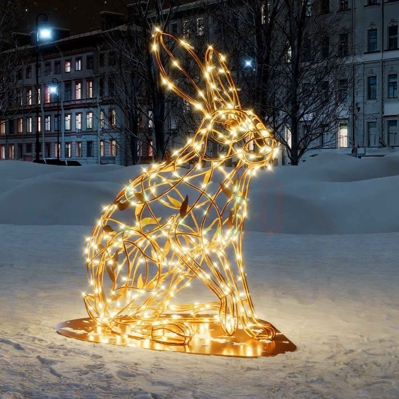 Объёмная световая фигура «Заяц» — яркое новогоднее украшение для улицы, парка или фасада. Высота — 0,9 м, алюминиевый каркас, IP65. Два цвета свечения: золотой и серебряный. Устойчива к морозам до –50 °С, подключение от сети, работает до 50 000 часов. Подходит для частных, городских и коммерческих проектов.