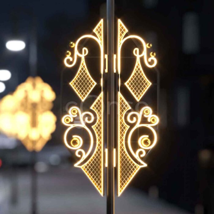 Новогодняя консоль для столбов освещения — это световая уличная фигура, разработанная специально для быстрого, эффектного и безопасного оформления опор освещения. Размер консоли — 0,95×2 метра. Она подходит для размещения на фонарных столбах, мачтах, перголах, фасадах зданий и других вертикальных конструкциях. Такая фигура добавляет праздничную атмосферу и заметный акцент на улицах, в парках, у ТЦ, в бизнес-центрах и на городских площадях.