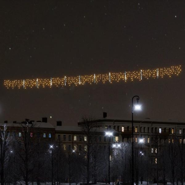 Данное световое решение создаёт эффект снежной метели и новогоднего настроения за счёт комбинированного свечения: ровная тёплая или холодная «Бахрома» дополняется динамичными нитями «Падающей капли». Это один из самых востребованных форматов для оформления улиц, пешеходных переходов, фасадов торговых центров, ресторанов, жилых комплексов и городских пространств.
