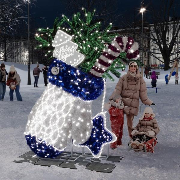 Инсталляция подключается к стандартной сети и не требует специального оборудования. Благодаря продуманной конструкции монтаж выполняется быстро, что позволяет оперативно подготовить город к праздникам. Фигура может использоваться многократно на протяжении нескольких сезонов без потери яркости и декоративного эффекта.