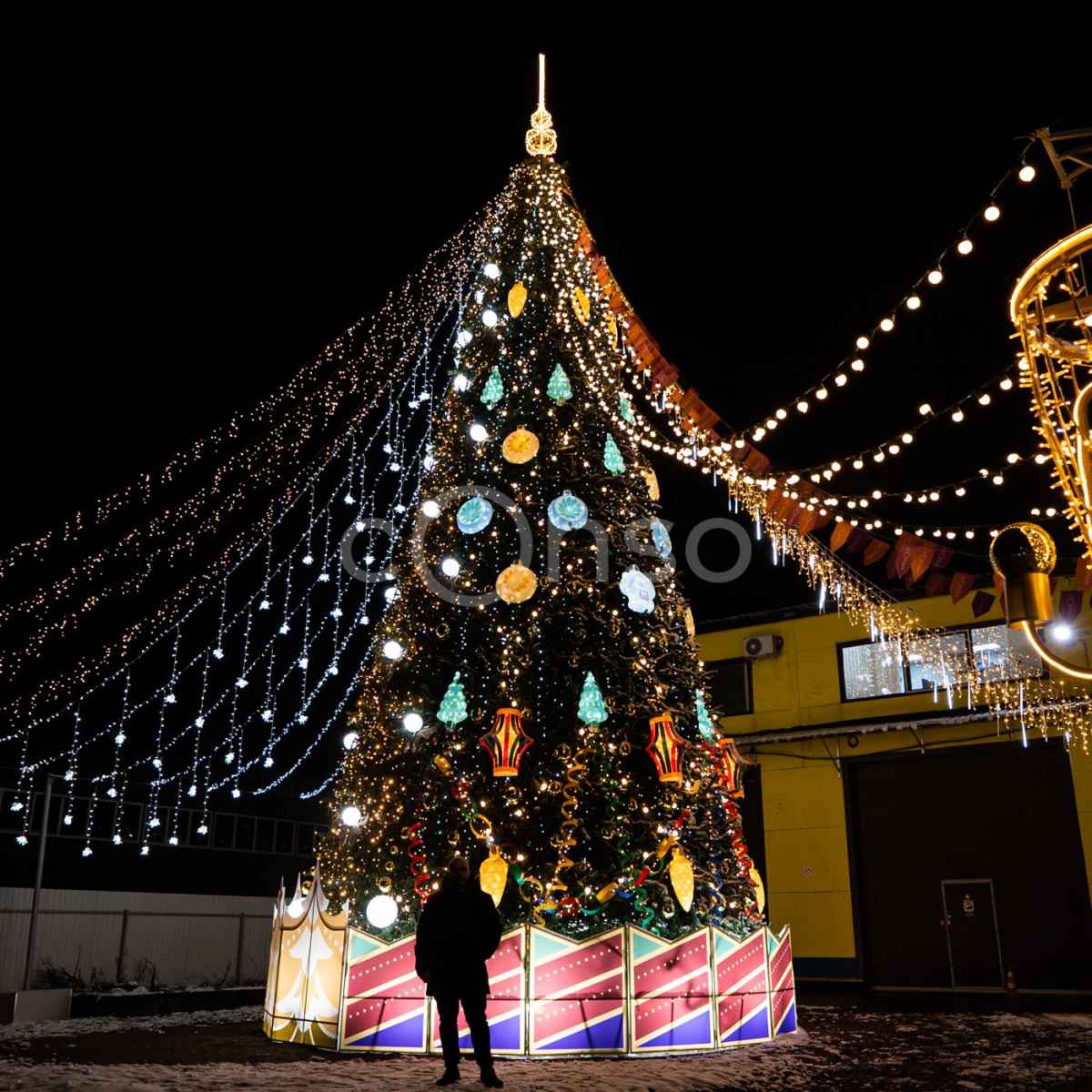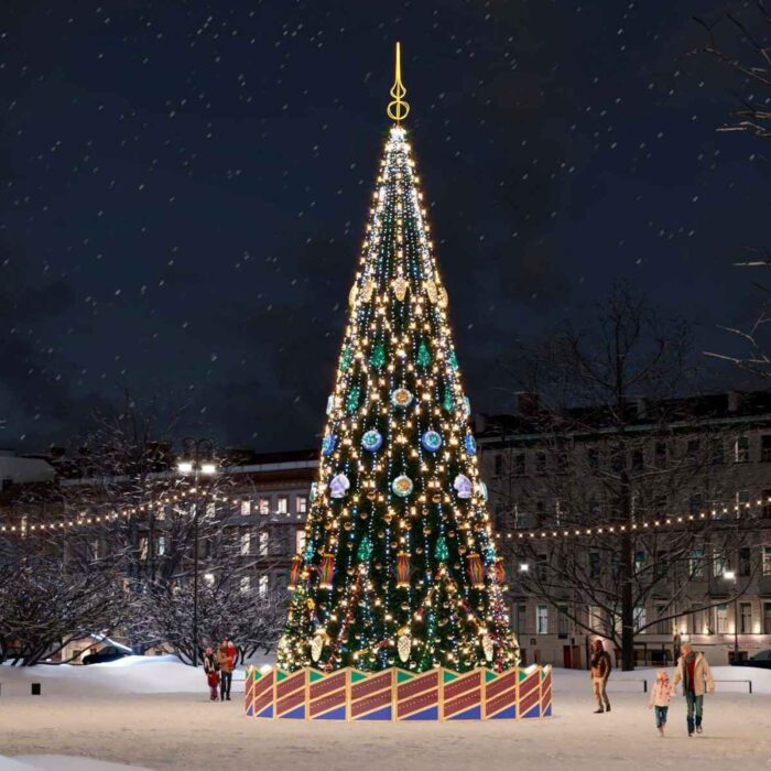Ёлка «Советская» передаёт дух традиционных зимних праздников: сочетание тёплого свечения, равномерной подсветки ветвей и яркого навешивания со звёздами и шарами. Эта модель идеальна для локаций, где важно создать атмосферу семейного праздника и ностальгии — без избыточной яркости и кричащих цветов. Подсветка равномерно распределена по высоте, что обеспечивает мягкий объёмный свет и ровное сияние со всех ракурсов.