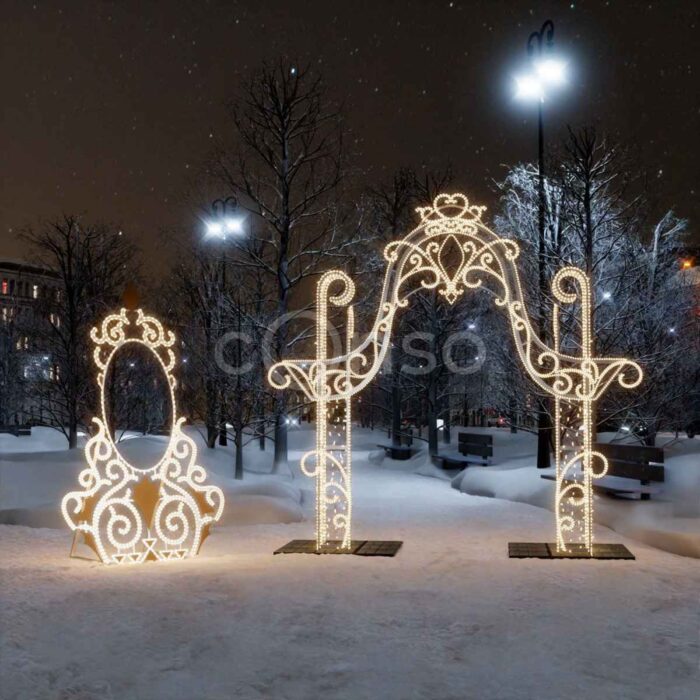 Вся конструкция рассчитана на эксплуатацию на улице в зимний период. Тёплый свет создаёт уютную атмосферу, которая уместна как в городской среде, так и на территории бизнес-центров, ТЦ, отелей, вокзалов, муниципальных парков. Комплект может использоваться как самостоятельно, так и в составе общей концепции оформления, дополняясь елями, фигурами или гирляндами.