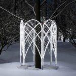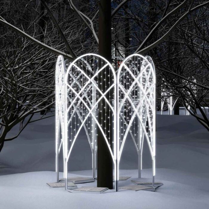 Фигура состоит из шести металлических модулей, которые объединяются в единое ограждение вокруг ствола дерева. Каждый модуль светится холодным белым светом, имитируя мерцание зимних «светлячков». Это добавляет волшебства любому городскому пейзажу.