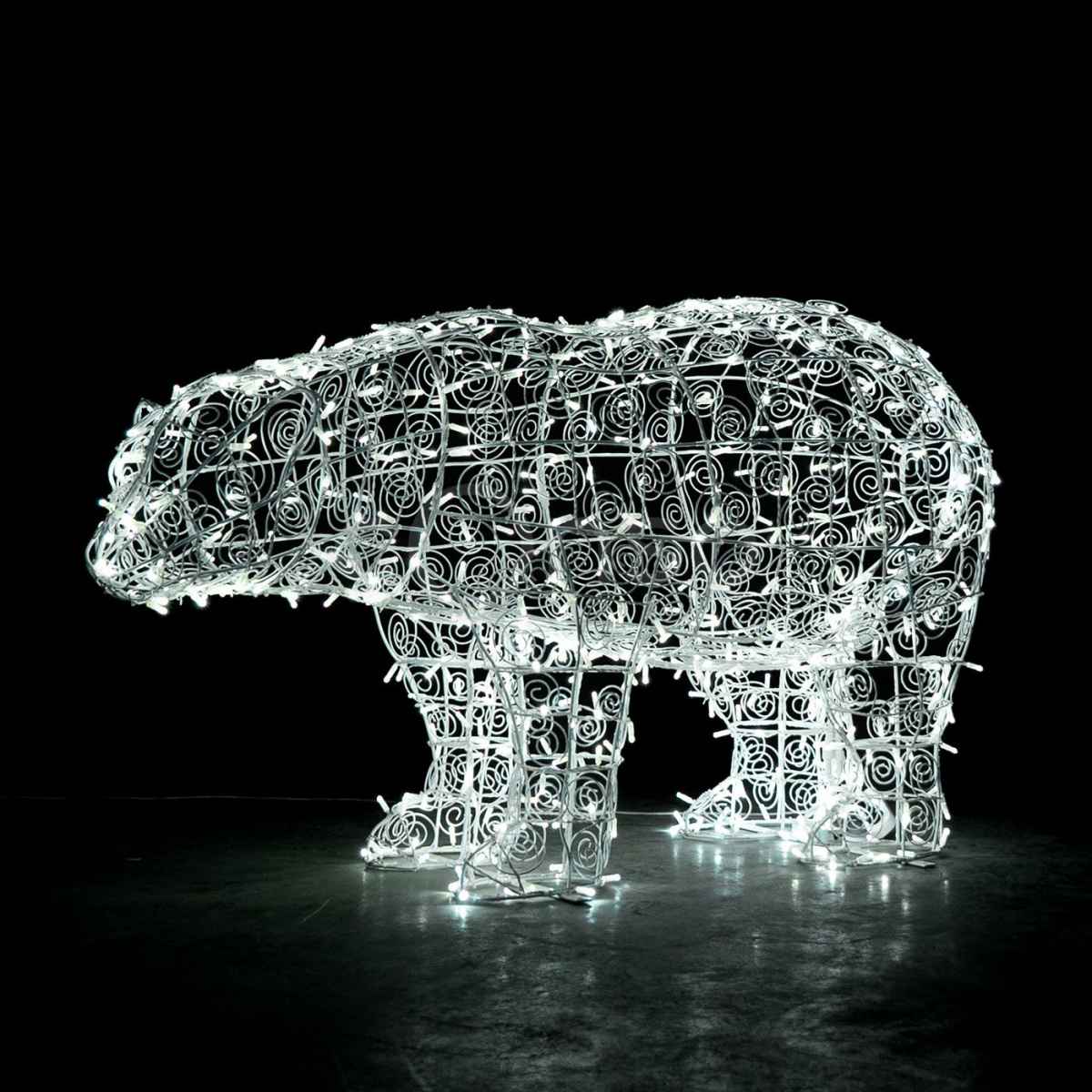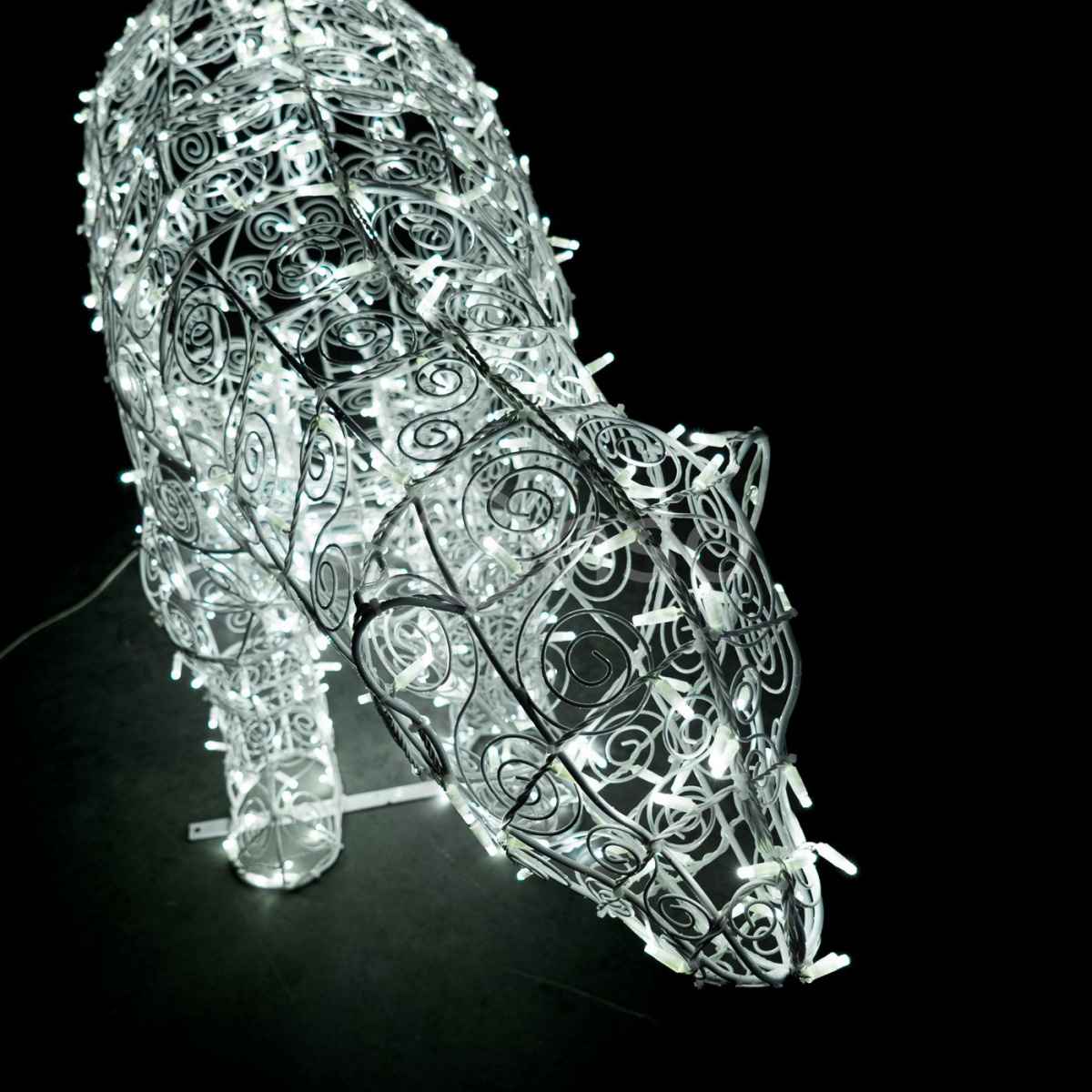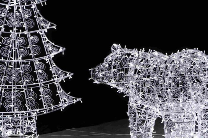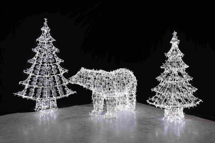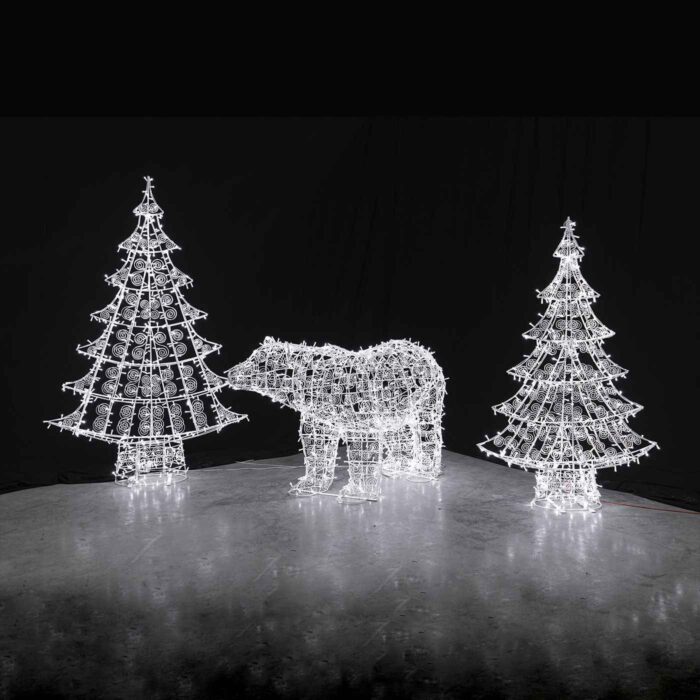 Сказочная световая композиция воссоздаёт атмосферу зимнего леса. Дружелюбный медведь среди двух ёлок высотой 2 и 2,5 метра создаёт уютную новогоднюю сцену. Каркас из оцинкованной стали выдерживает морозы до -50°C. Холодный белый свет подчёркивает естественность лесной композиции. JOYLED обеспечивает производство, доставку и монтаж световых инсталляций для оформления парков, торговых центров и городских пространств.