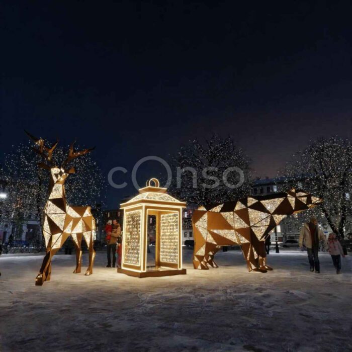 Композиция из полигональных фигур — это современный способ украсить город, торговую площадь или входную зону в новогодний период. Эти фигуры сразу выделяются на фоне классических украшений: минималистичная геометрия, выразительный силуэт, тёплое золотое свечение и большая высота делают их центром внимания и визуальной доминантой пространства.
