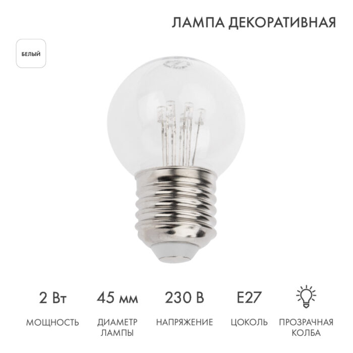 Ретро-лампа светодиодная Ø45 мм, 6 LED, 230В, Цоколь E27, 2 Вт, Белая