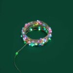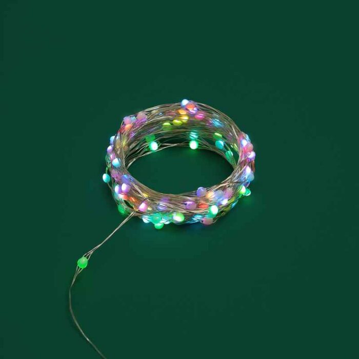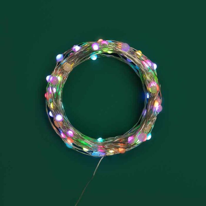Гирлянда выполнена на тонком, гибком и прочном серебристом металлическом проводе. Он устойчив к изгибам, легко принимает нужную форму и хорошо фиксируется на любых поверхностях — от веток до металлических перил.
