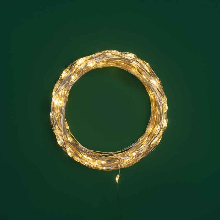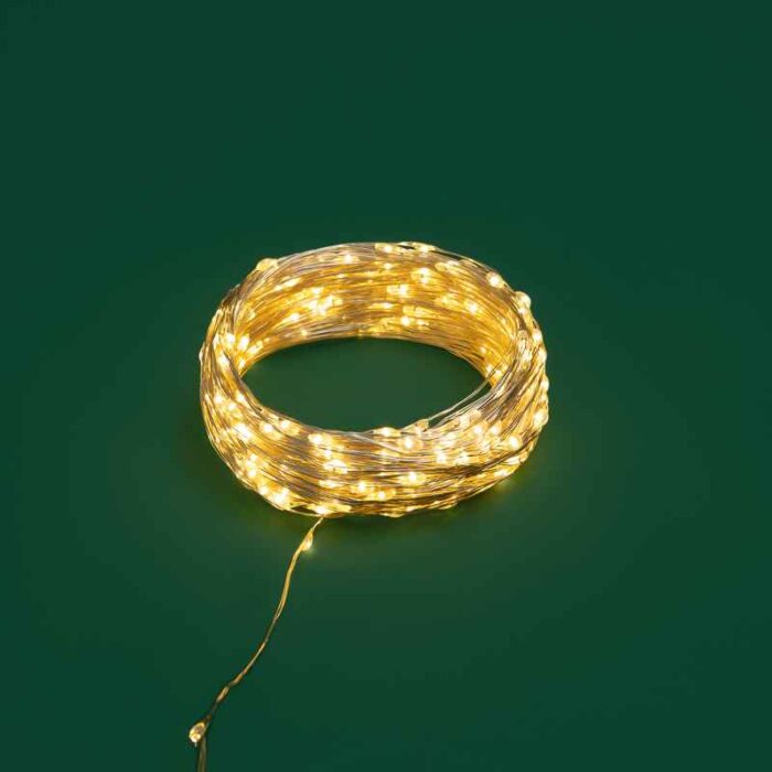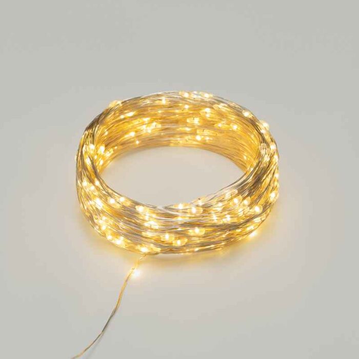 Тонкая гирлянда Роса длиной 30 метров с тёплым белым свечением и 300 LED — для создания уюта на улице. Постоянный режим, IP44, питание от сети. Металлический серебристый провод почти не виден на светлом фоне. Идеально для деревьев, заборов, колонн.