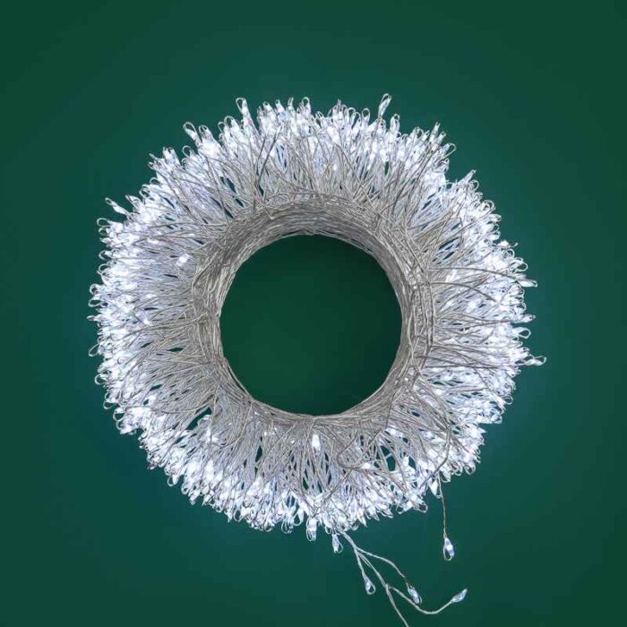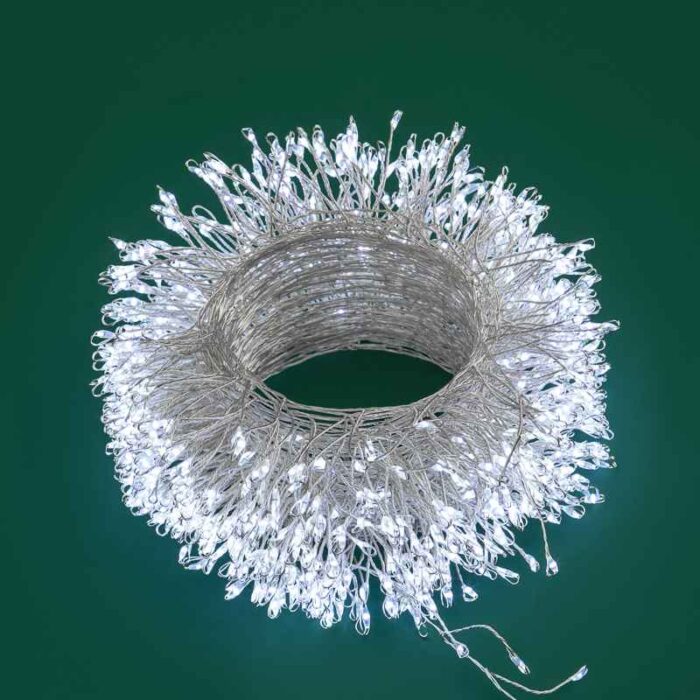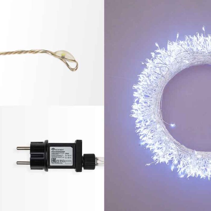 Лёгкая гирлянда-роса длиной 20 м с белым постоянным свечением и 1000 сверхминиатюрных светодиодов. Гибкий серебряный провод, питание от сети, защита IP44. Идеальна для деревьев, заборов, фотозон и навесов.