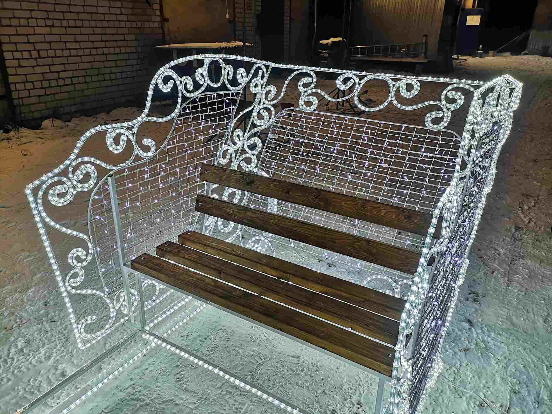Фигура отлично вписывается в композиции с другими световыми объектами: оленями, ёлками, шарами, арками. Это позволяет создавать масштабные световые сцены и сказочные сюжеты, где «Сани» становятся центральным элементом.