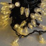 Шишки с тёплым белым светом создают мягкое, ненавязчивое освещение. Гирлянда отлично сочетается с живыми деревьями, хвойными композициями и деревянными элементами экстерьера.