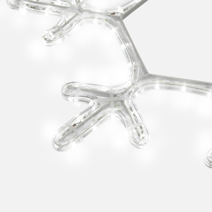Светодиоды внутри дюралайта излучают равномерный белый свет. Это классический выбор, который сочетается с любыми цветами фасада, архитектурными стилями и декоративными элементами. Белая снежинка гармонирует как с тёплыми, так и с холодными гирляндами, дополняет неоновую контурную подсветку и подчёркивает праздничную атмосферу без излишней яркости или цветового диссонанса. Статичное свечение делает свет мягким и «спокойным», а значит — идеальным даже для жилых комплексов или коттеджей, где важен комфорт соседей.