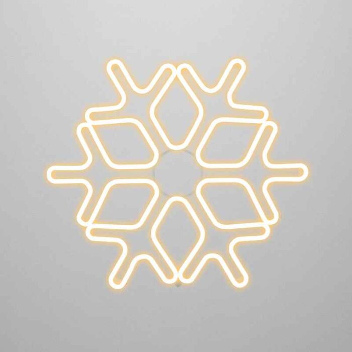 Фигура выполнена на жёстком металлическом каркасе, а основным световым элементом служит гибкий неон. Это решение обеспечивает равномерное свечение по всему периметру фигуры и подчёркивает контуры снежинки. Гибкий неон визуально напоминает классические трубки, но лишён их хрупкости и хрупких стеклянных элементов — он устойчив к вибрациям и температурным перепадам.