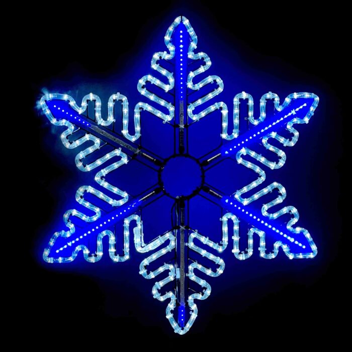Фигура выполнена в виде классической шестилучевой снежинки. Это узнаваемый зимний символ, который уместно смотрится в городских аллеях, на фасадах ТЦ, входных группах, площадях, а также на опорах освещения и балконах. Снежинка отлично сочетается с другими плоскими или объёмными фигурами, гирляндами, арками и надписями, создавая полноценную световую сцену.