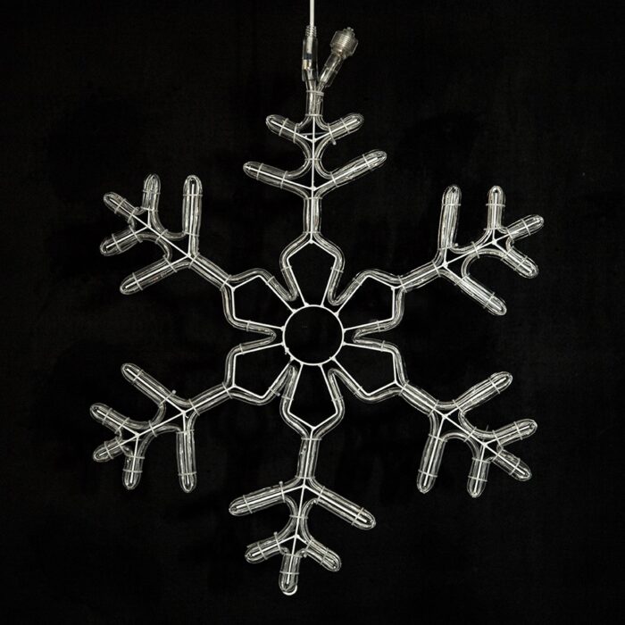 Снежинка легко вписывается в фасадное освещение, витринное оформление, городские инсталляции, декоративные композиции — как самостоятельный элемент или в составе ряда.