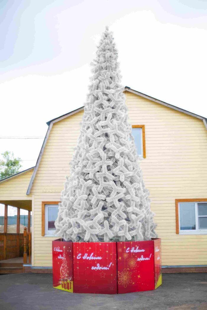 Уличная новогодняя искусственная елка представляет собой сборную металлическую конструкцию, включающую основание и ствол, который покрыт порошковой краской с использованием технологии горячей сушки. Ветви изготовлены из проволоки, ПВХ-пленки или лески, что придает им прочность и долговечность, делая их устойчивыми к неблагоприятным погодным условиям, таким как дождь, снег и сильный ветер. Материалы на основе ПВХ имитируют естественную хвойную зелень, создавая иллюзию живого дерева, а также защищают конструкцию от влаги и ультрафиолетового излучения.