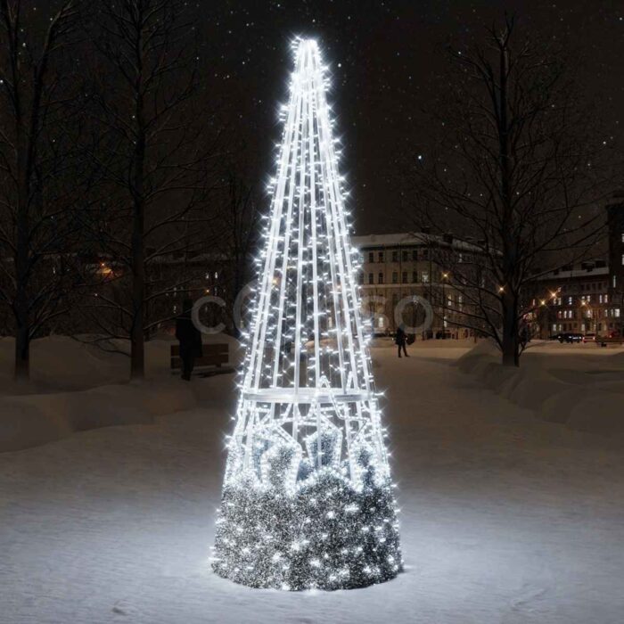 Каркас фигуры выполнен из алюминиевого профиля — лёгкого, прочного и устойчивого к коррозии. Такой материал подходит для уличного применения, выдерживает нагрузки ветра и осадки. Каждая звезда аккуратно крепится к конусной структуре, создавая трёхмерный объём.