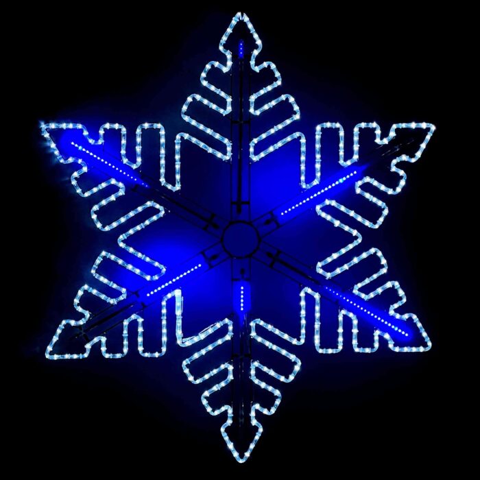 Каркас фигуры выполнен из оцинкованной стали с покраской, что обеспечивает устойчивость к коррозии, осадкам и механическим повреждениям. Светящийся контур сформирован с помощью дюралайта — гибкого светодиодного шнура, равномерно распределённого по периметру снежинки. Контрастный чёрный провод подчёркивает геометрию фигуры и придаёт ей узнаваемый стиль.