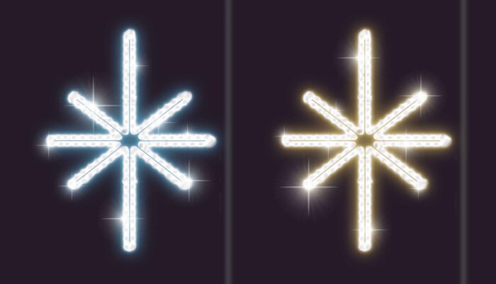 Снежинка изготовлена на прочном металлическом каркасе с защитной порошковой окраской. Светодиоды надёжно закреплены по периметру и в центральной части фигуры. Свечение бывает двух вариантов — тёплый или холодный белый. Это позволяет подобрать оформление в зависимости от общей концепции: уютный домашний стиль или строгая городская эстетика.