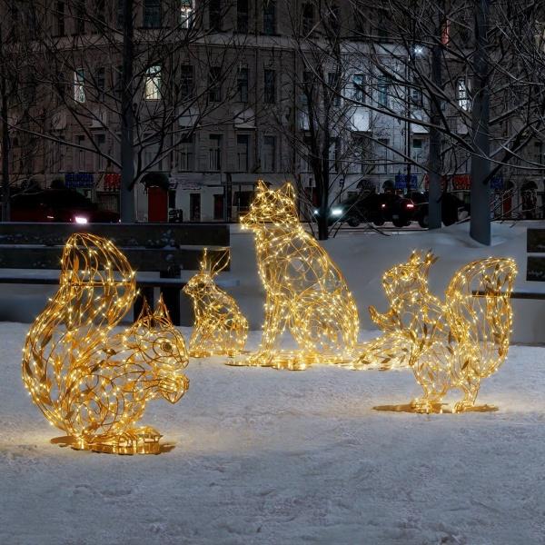 Светодиодные фигуры золотых животных JOYLED — набор объёмных уличных инсталляций: белка, белочка с орехом, заяц и лиса. Прочные алюминиевые каркасы, свечение золотым светом и защита IP65 обеспечивают долговечность и безопасность. Подходят для украшения парков, площадей, ТЦ и жилых комплексов. Доступно изготовление под заказ и монтаж под ключ.
