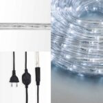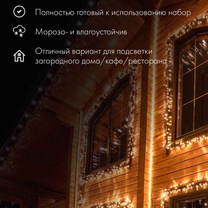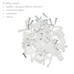 Герметичный корпус, соответствующий стандарту IP65, обеспечивает защиту от пыли и воды, что делает изделие подходящим для использования как в помещениях, так и на открытом воздухе. В комплект входит дюралайт длиной 14 метров, кабель питания с диодной лентой, а также крепежные элементы – саморезы и клипсы.