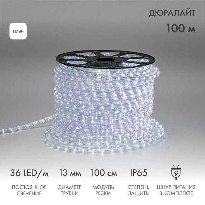 Светодиодный Дюралайт Ø13 мм, двухжильный, БЕЛЫЙ, 230В, 36 LED/м, постоянное свечение, модуль 1м, Бухта 100м