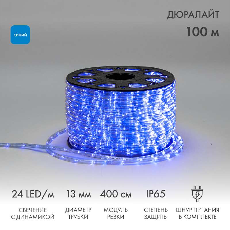 Светодиодный Дюралайт Ø13 мм, трехжильный, СИНИЙ, 230В, 24 LED/м, свечение с динамикой, модуль 4м, Бухта 100м, Эконом