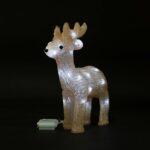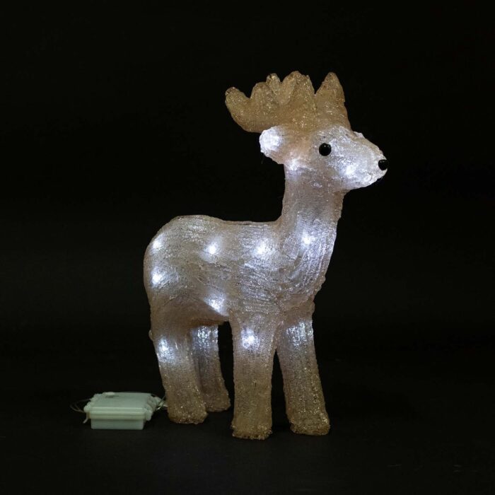 Фигура выполнена в форме узнаваемого новогоднего персонажа — оленя. Белое свечением из 24 встроенных светодиодов создаёт мягкое, равномерное и статичное свечение, подчёркивающее чистоту, аккуратность и зимнюю атмосферу. Корпус выполнен из акрила — прочного, влагостойкого и светорассеивающего материала, который делает подсветку более выразительной и при этом безопасной для использования вблизи людей и животных.