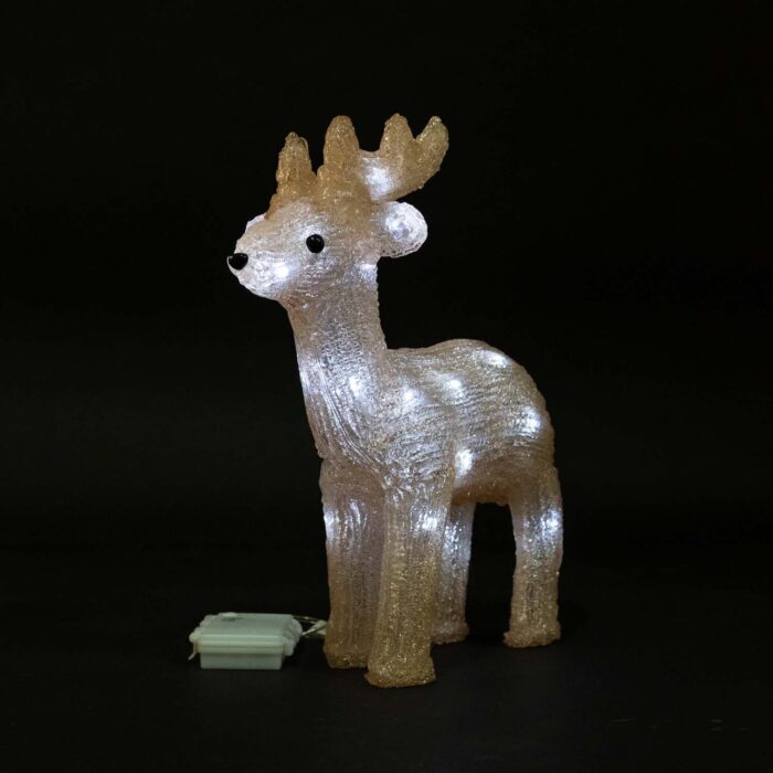 Компактная 3D-фигура «Олень» высотой 34 см с белым свечением и 24 светодиодами. Работает от батареек, не требует подключения к сети — идеально подходит для мобильного и быстрого декора. Защита IP54 позволяет использовать как в помещении, так и на улице. Материал корпуса — прозрачный акрил, создающий эффект морозной кристалличности.