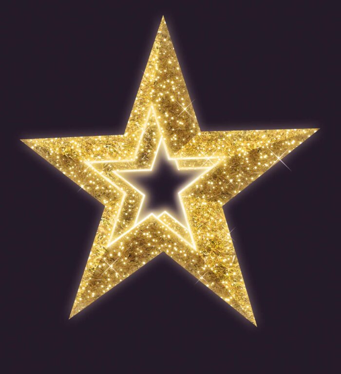 Световая фигура «Звезда» СК-227-6 — это подвесной элемент, который задаёт праздничное настроение и архитектурную ритмику сразу в нескольких плоскостях. Конструкция выполнена в форме объёмной звезды с каркасом из металла и ярким золотым свечением.