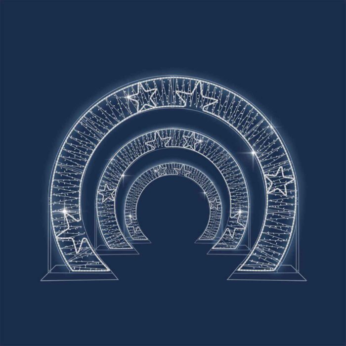 Эффект туннеля из света создаёт ощущение магии, приглашает пройти сквозь сияние, сделать фото, замедлиться и почувствовать атмосферу праздника. Композиция хорошо вписывается в концепции «зимнего городка», фотозоны, входной группы или тематической аллеи. Простая модульность позволяет масштабировать решение — добавлять арки, менять форму, дублировать тоннели.