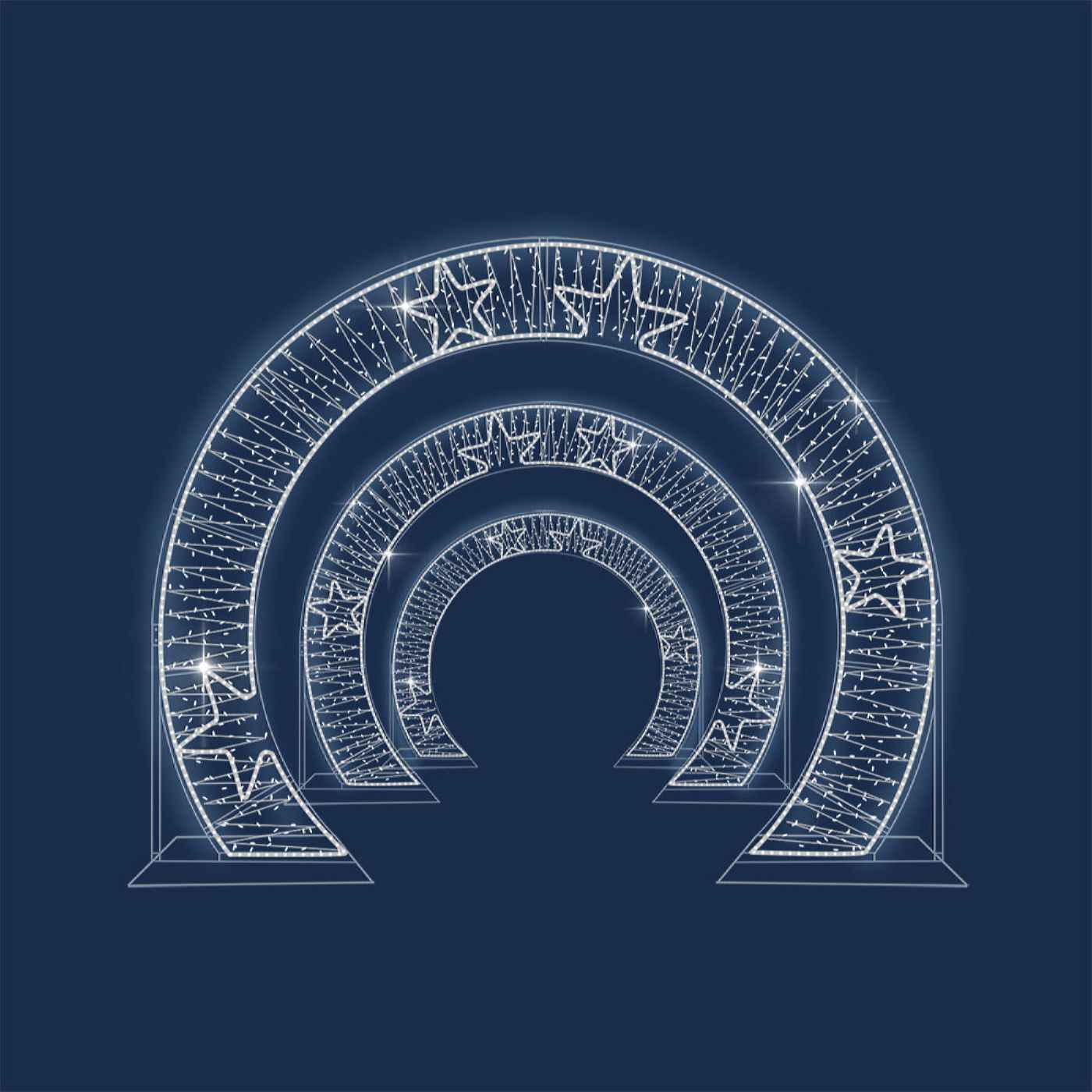 Светодиодный тоннель из трёх арок — это не просто украшение, а полноценный архитектурный элемент, который придаёт локации объём, глубину и праздничное настроение. Такая конструкция становится центром внимания на любой площади, в парке, возле торгового центра или на городской аллее. Она подходит как для новогоднего оформления, так и для круглогодичных инсталляций на корпоративных, городских или частных мероприятиях.