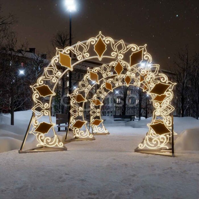 Светодиодный тоннель из уличных арок от JOYLED — эффектное решение для оформления парков, площадей, входных групп ТРЦ и городских улиц. Высота более 3 м и золотое сияние создают атмосферу праздника и превращают пространство в фотозону. Прочный алюминиевый каркас и защита IP65 обеспечивают надежность в любую погоду. Конструкция легко масштабируется и может использоваться как самостоятельная декорация или часть комплексного новогоднего оформления.