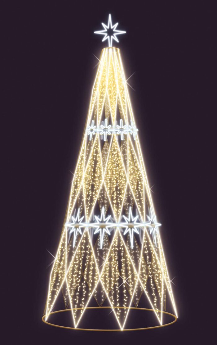 Каркас световой ели выполнен из прочного металла, предназначенного для длительной эксплуатации в уличных условиях. Он не подвержен коррозии, устойчив к перепадам температур и воздействию влаги. За счёт своей модульной конструкции изделие легко транспортируется, собирается на месте монтажа и прочно фиксируется. Такое решение обеспечивает не только визуальную стабильность фигуры, но и её устойчивость к порывам ветра и другим погодным факторам.