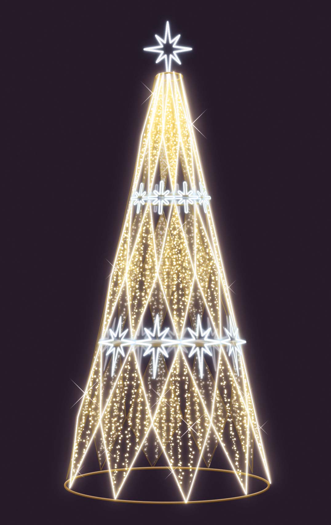 Световая ель СК-201-16 высотой 4 метра — эффектное праздничное оформление улиц, площадей, парков, ТЦ и скверов. Каркас из металла, защищён от влаги и мороза (IP65). Цвет свечения — тёплый белый, создаёт атмосферу уюта и волшебства. Подключение — от сети. Подходит для круглогодичной эксплуатации.