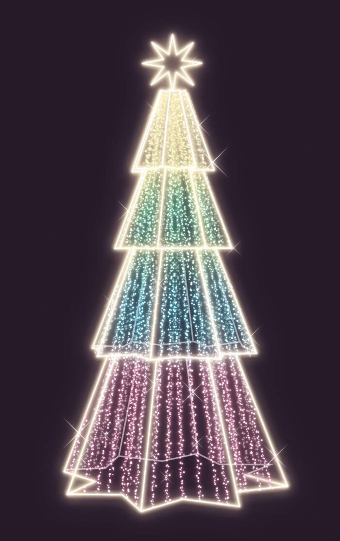 Световая ель СК-201-25 — это масштабная архитектурная фигура, созданная для оформления улиц, парков, торговых и общественных пространств в праздничный сезон. Высота 6 метров делает её видимой издалека — она мгновенно притягивает внимание, формирует атмосферу праздника и становится центральным элементом оформления.
