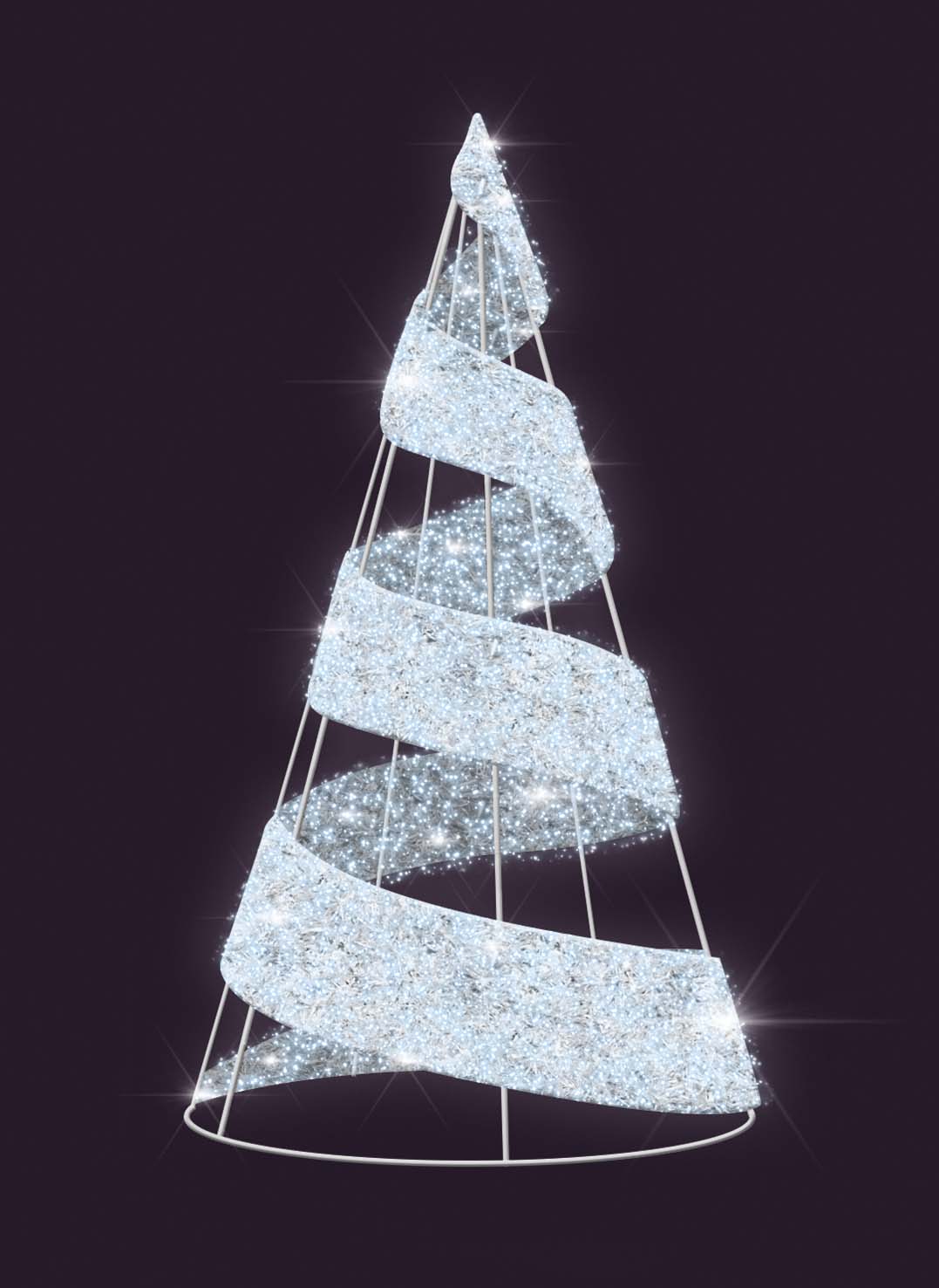 Ёлка выделяется эффектным холодным свечением. Светодиоды равномерно распределены по всей поверхности, создавая кристальную, морозную атмосферу. Это решение часто выбирают для оформления городских объектов, парков, площадей, а также входных групп торговых центров, бизнес-комплексов и гостиниц.