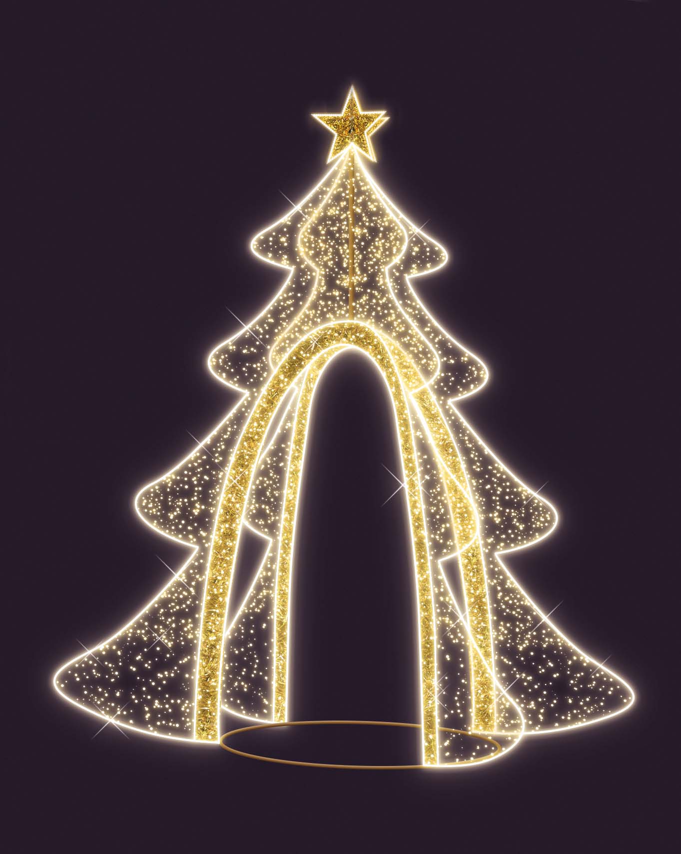 Форма каркасной ели выполнена в лаконичном, но выразительном дизайне — с чёткой геометрией, устойчивой основой и равномерной заливкой тёплого света. Световые элементы расположены по всей высоте, создавая ощущение цельности и объёма даже на большом расстоянии.