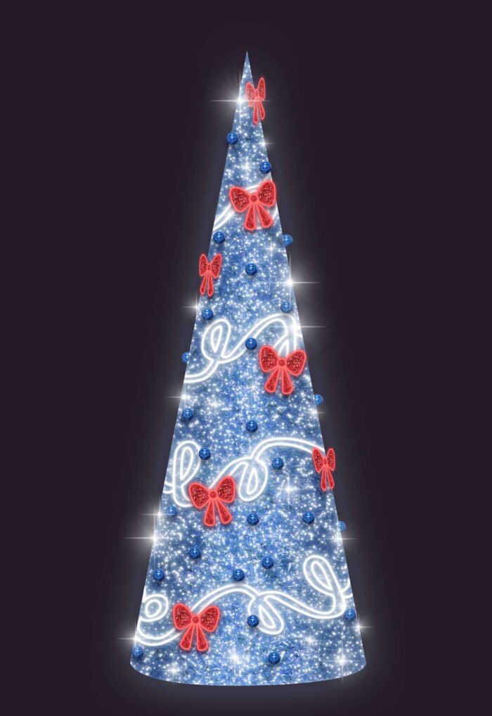 Световая ель СК-184 с эффектным свечением в цветах триколора (бело-сине-красный) — выразительный элемент для городского или праздничного оформления. Высота фигуры — 3 м, ширина — 2 м. Подходит для установки у ТЦ, на улицах, в парках и на входных группах. Металлический каркас, IP65, питание 24 В.