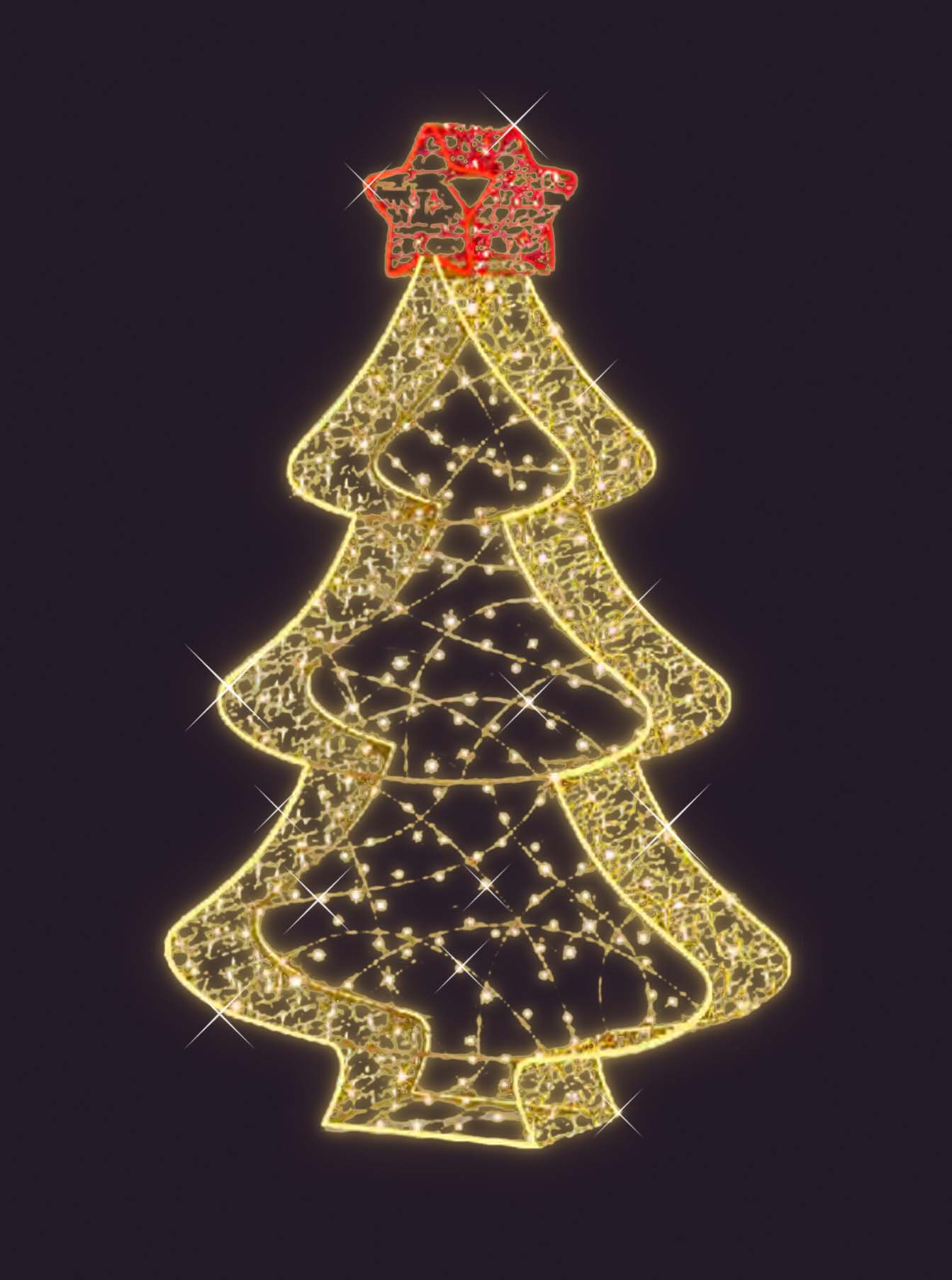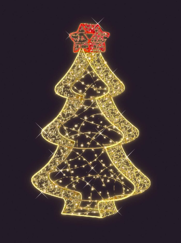 Каркасная форма придаёт «Ёлке» лёгкость, а равномерное золотое свечение делает её выразительной и элегантной. Это решение подходит для оформления любых объектов: от фасадов ТЦ и входных групп до детских площадок и муниципальных аллей.
