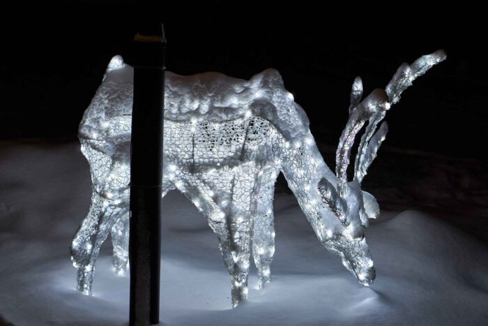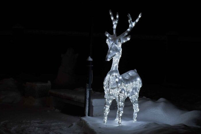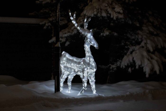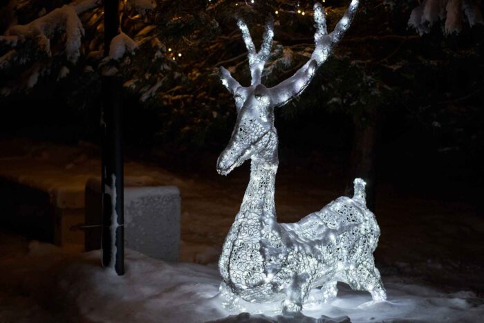 Главная особенность композиции — холодное белое свечение, которое подчёркивает изящество форм и добавляет фигуре лёгкость. Такой оттенок света напоминает о морозной зиме, хрустящем снегу и искрящихся на солнце снежинках. В вечернее время фигура производит особенно впечатляющий эффект, создавая праздничное настроение и формируя яркую фотозону.