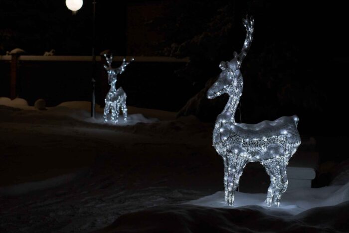 Холодное свечение универсально: оно легко сочетается с другими элементами новогоднего оформления — гирляндами, арками, ёлками и световыми фигурами. В составе комплексной декорации «Композиция из 4-х оленей» может стать центральным элементом или дополнить уже существующую концепцию.