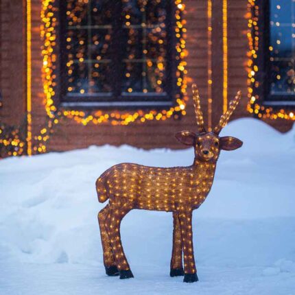 Объёмная световая фигура «Бурый олень» высотой 1 м — универсальное решение для новогоднего оформления фасадов, улиц, парков и частных участков. Каркас выполнен из акрила, устойчив к осадкам и морозам. 380 белых светодиодов создают эффект чистого свечения. Готов к установке, IP65, питание 24 В.