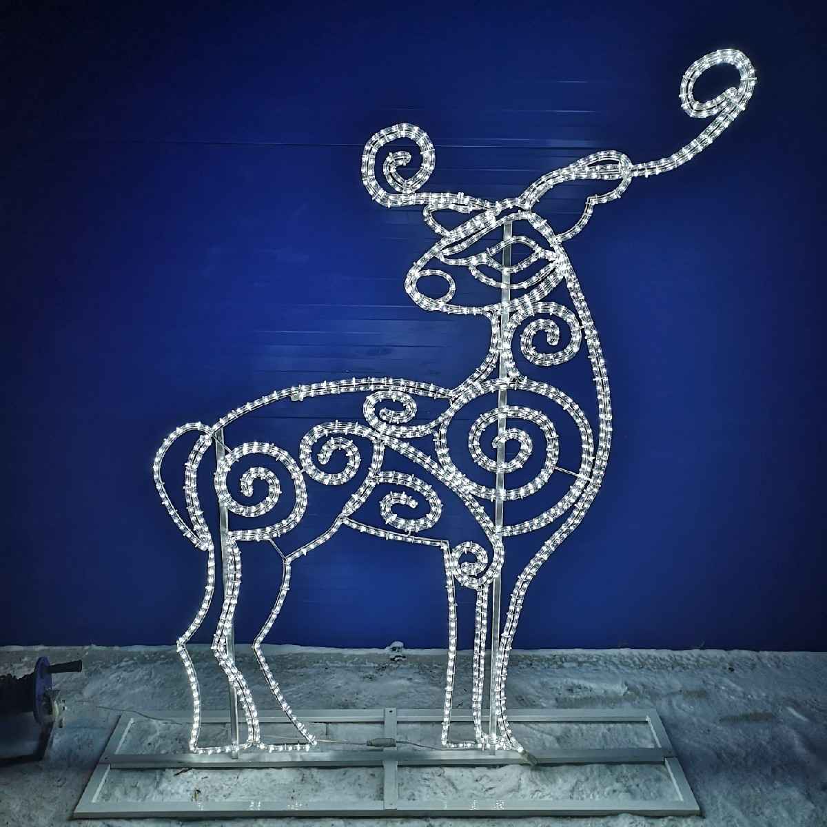Плоская световая фигура «Олень ажурный» высотой 1,6 м — декоративный элемент для уличного и фасадного оформления. Ажурный каркас из стали с антикоррозийным покрытием, степень защиты IP54. Подключение 220 В. Цвет свечения — по выбору. Подходит для улиц, ТЦ, фотозон и частных территорий.