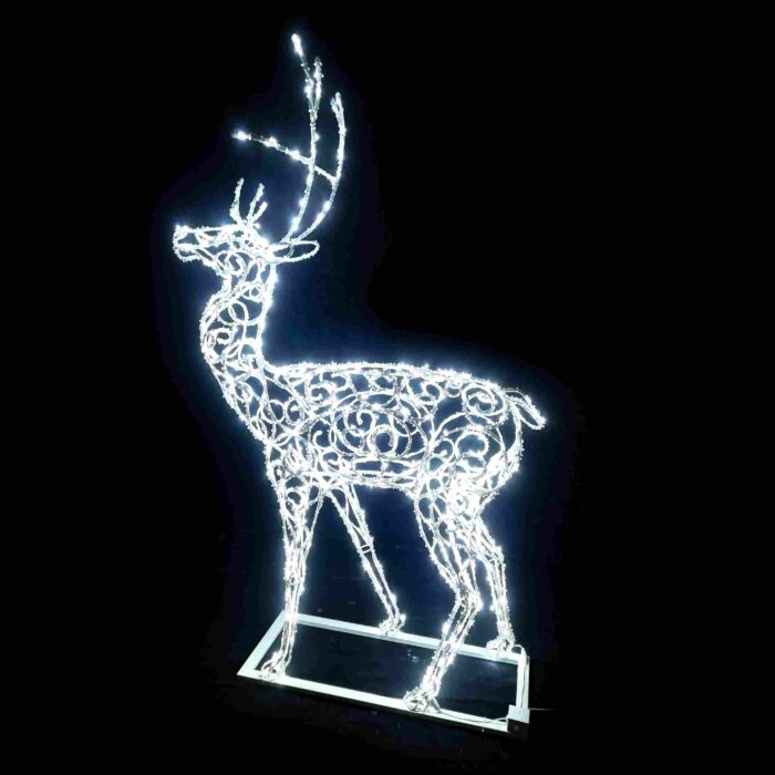 Каркас изготовлен из стали с антикоррозийным покрытием. Такая фигура устойчива к снегу, ветру, влаге и резким перепадам температур. За счёт степени защиты IP65 световой олень подходит для круглогодичной установки на улице.