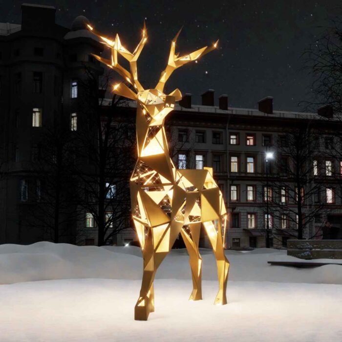 Благодаря своей оригинальной полигональной форме, фигура напоминает оленя, вылепленного из множества граней — словно оригами из света и металла. Такой стиль подчёркивает современный подход к уличному декору и делает фигуру уместной как на городской площади, так и в коммерческом пространстве — возле отеля, бизнес-центра, ТРЦ или музея.