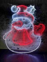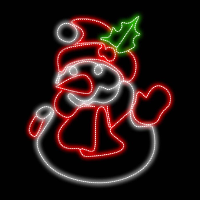 Фигура выполнена в классическом плоском 2D-формате, что упрощает установку и транспортировку. При этом благодаря световому дизайну и выразительной форме снеговик заметен издалека и моментально привлекает внимание. Он одинаково уместен как на центральной площади города, так и на входе в торговый центр, возле кафе, в парке или во дворе частного дома.